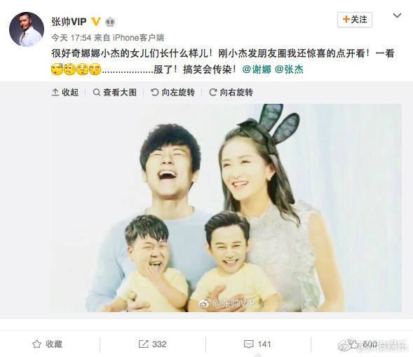 张杰朋友圈晒“全家福” 把双胞胎女儿P成何炅杜海涛。