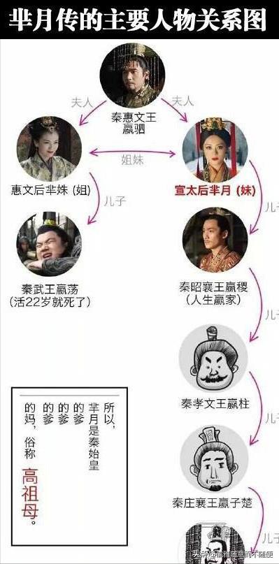 在历史上,芈月是个牛气冲天的人物。因为自她开始,往下四代,她孙子的孙子(玄孙)就是我国帝王界著名的带头大哥——秦始皇嬴政。没错,在这里为广大观众解答,芈月正是大家众所周知的秦始皇的爷爷的奶奶,也就是秦始皇的高祖母。