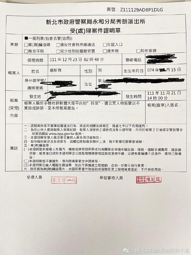 并晒出自己在派出所报案的照片,表示 " 我对张兰正式提出告诉。"