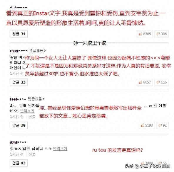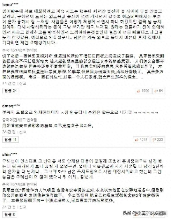 虽然安宰贤的声明发得早,但是让人认为是准备了两三天才憋出来的,而具惠善的声明则是看到安宰贤的声明后用了一个小时写出来的,而且细节和语言都更丰富,极具感染力,所以大家几乎都是站在具惠善一边,声讨安宰贤的不负责任、狼心狗肺。