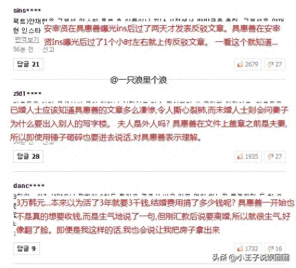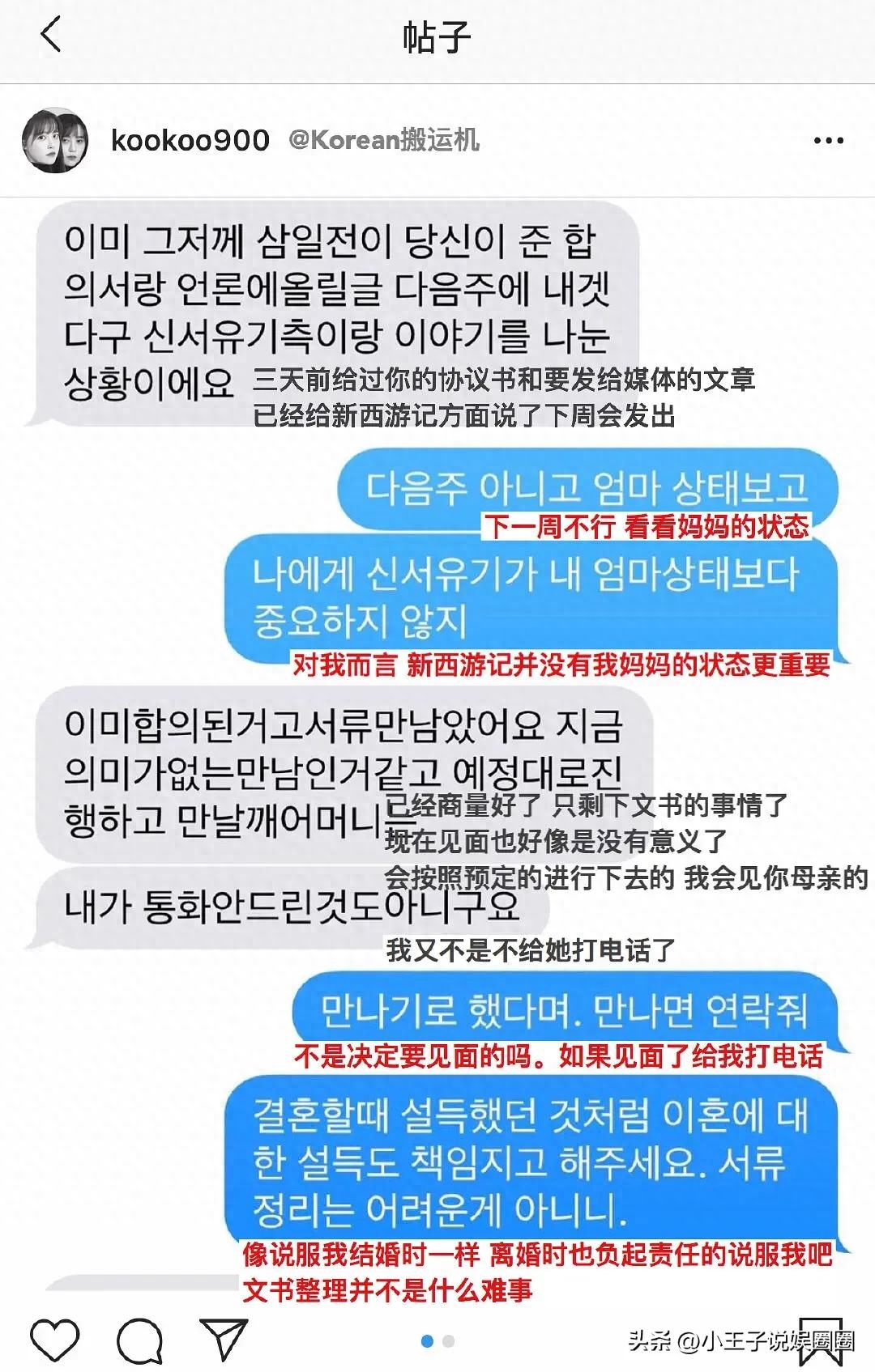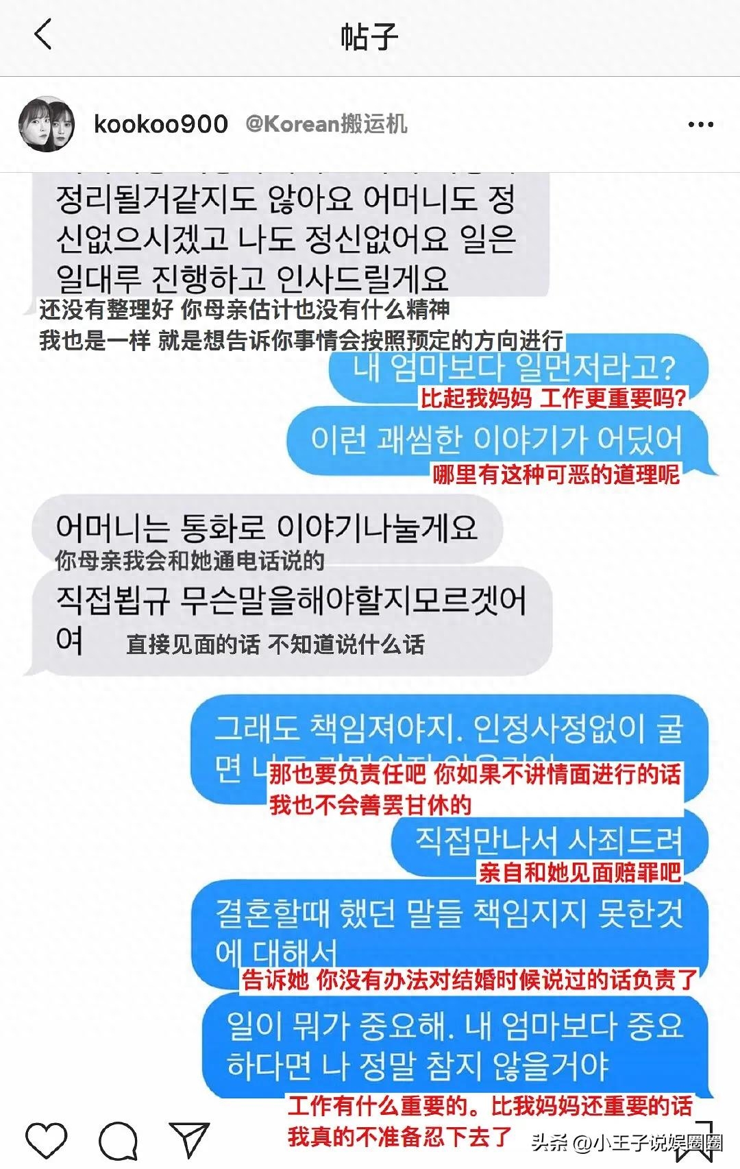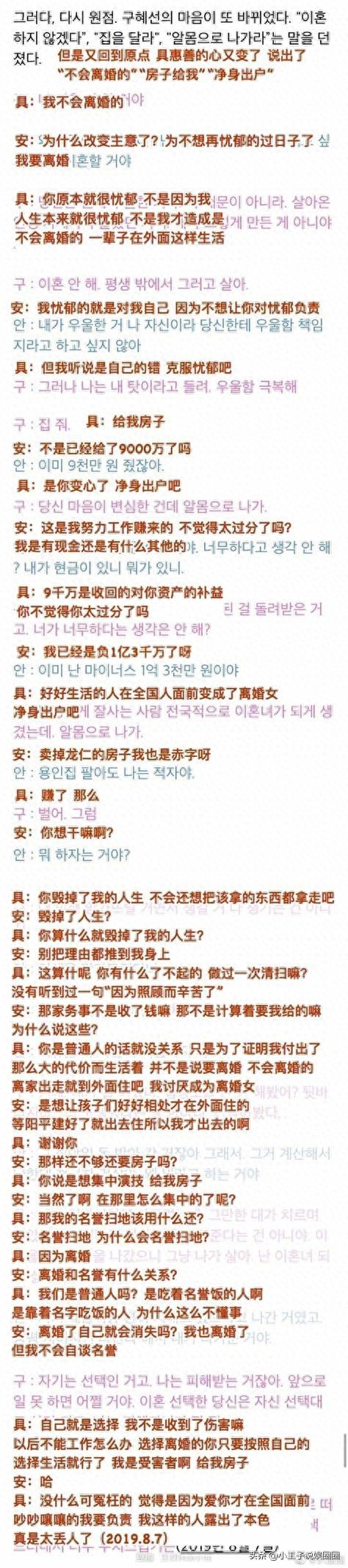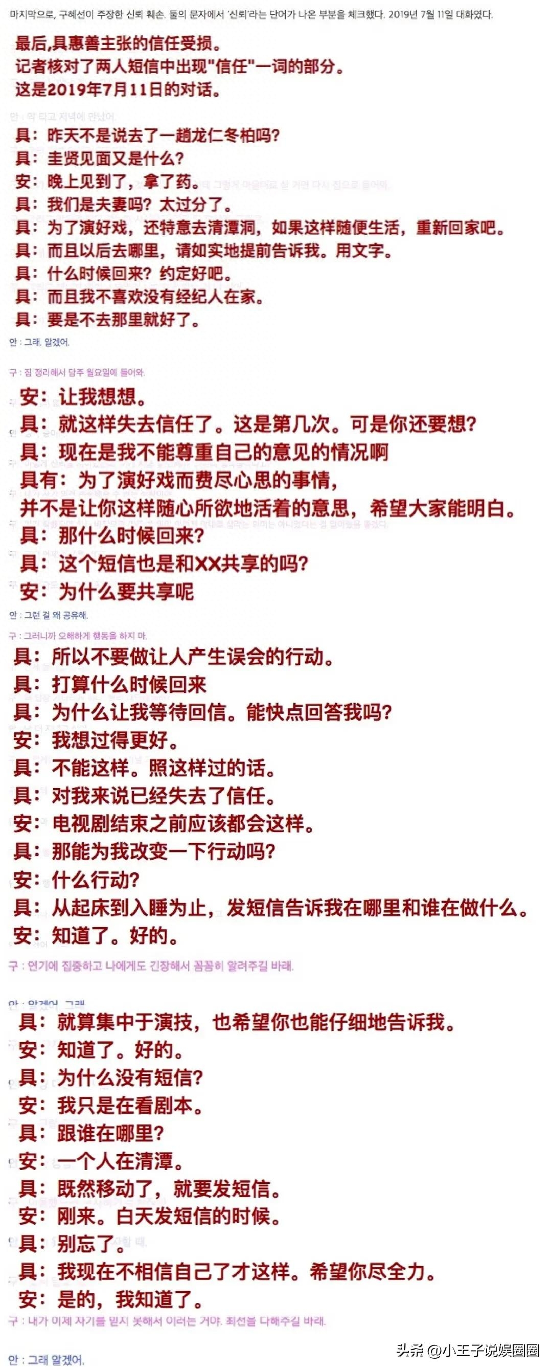还有其他大量的两人日常对话,离婚期间对于房子的归属和宠物寄养等等扯皮。可以说D社曝光的聊天记录推翻了比较多具惠善之前对安宰贤的批判,也让大家看到了两人相处中她强势的一面。