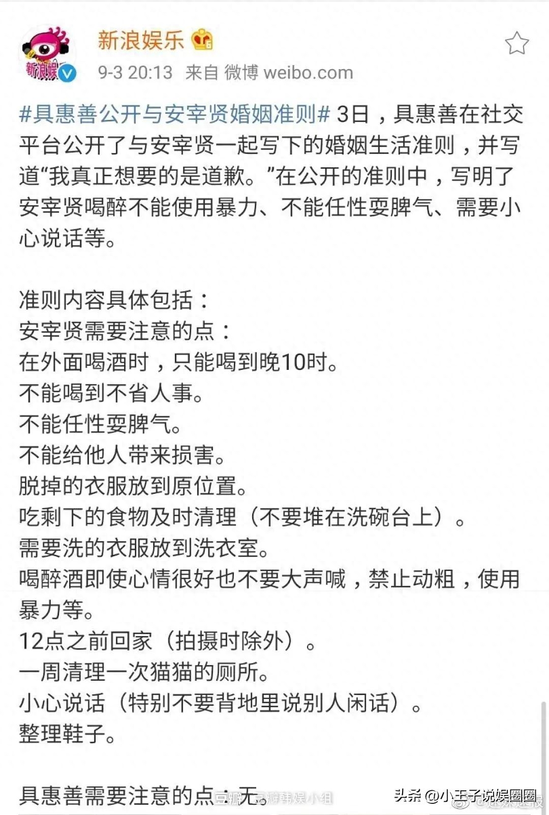 时间来到了9月,具惠善在ins上公布了与安宰贤的婚姻准则,规定了13条安宰贤需要注意的点,对于具惠善需要注意的部分则是无。