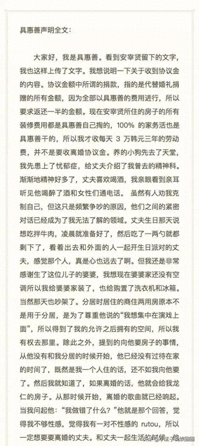 在具惠善晒出的两人聊天记录中,安宰贤拒绝见面讨论离婚事宜,也拒绝等具惠善的母亲病好之后再商量离婚的事情,而是想着不能影响他当时正在参加的综艺节目《新西游记》,下周就由媒体发布他授权的协议书和离婚说明。