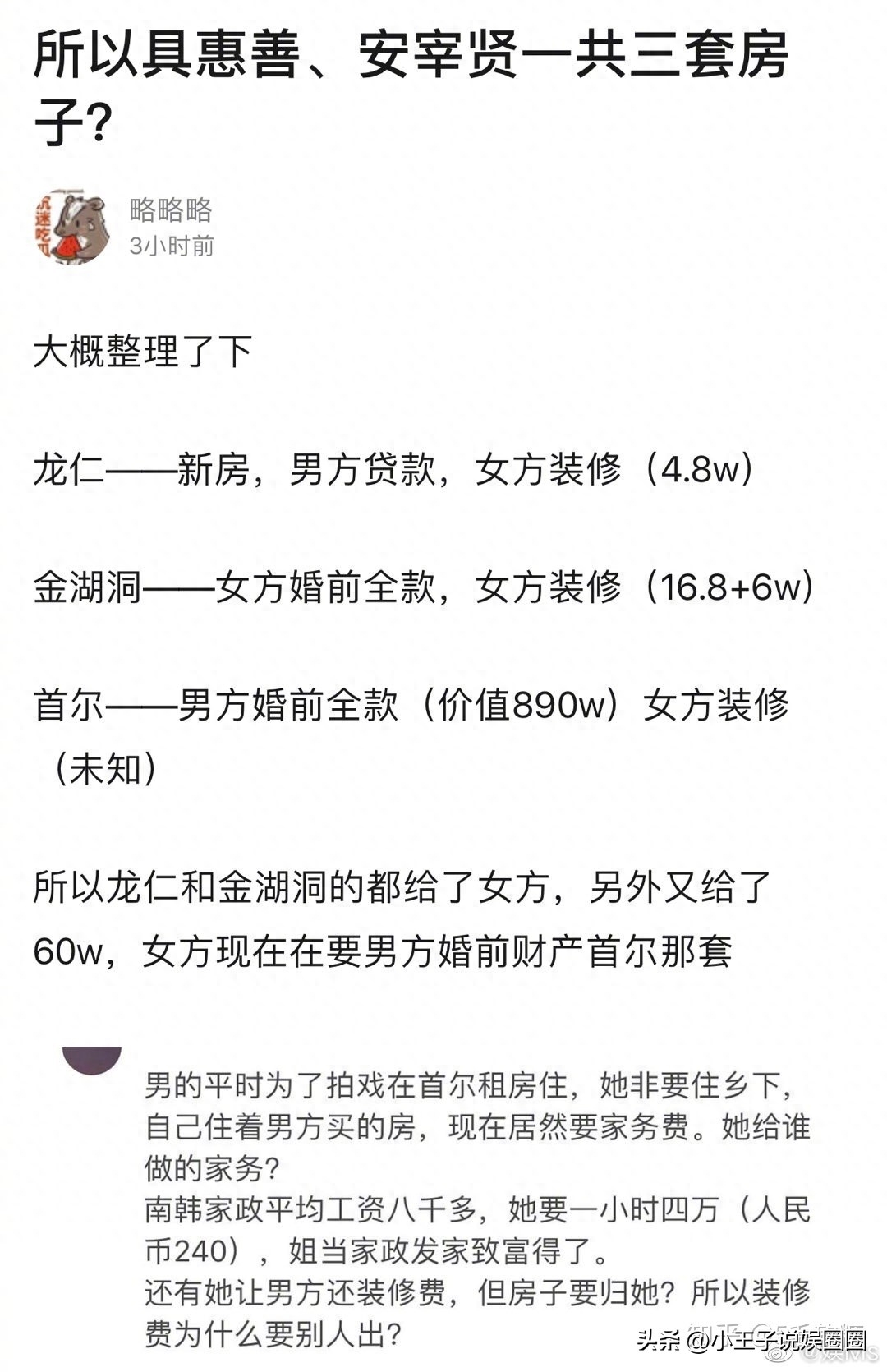 根据曝光出来的对话,具惠善在积极争取三套房子的归属权,如同两人聊天记录里所言要让安宰贤净身出户。