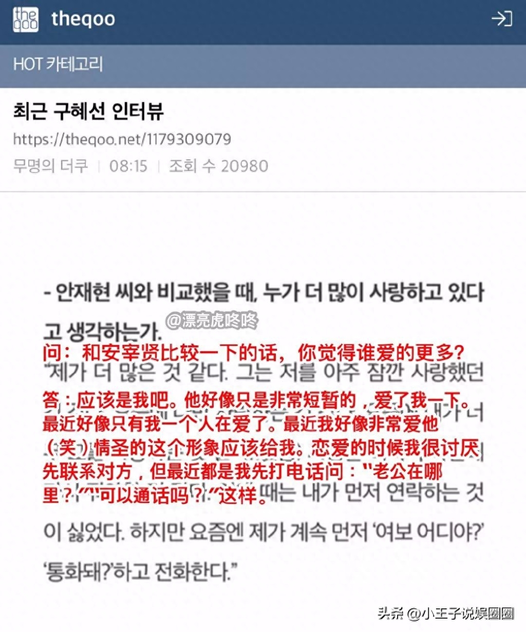 这时韩国网友也挖出了之前具惠善接受媒体采访时回答的问题“和安宰贤比较一下的话,你觉得谁爱得更多”。