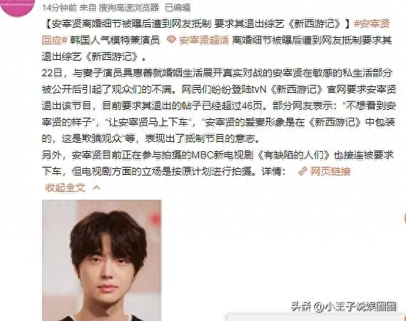 这时针对安宰贤的民怨也沸反盈天,被品牌商中断了化妆品和衣服的代言,网友也要求安宰贤退出《新西游记》的录制。