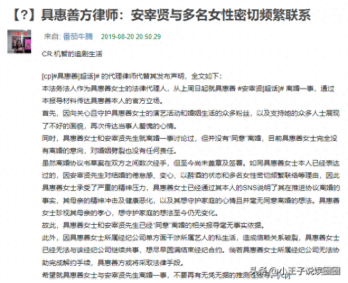 具惠善在看到安宰贤方的声明之后,在1小时内火速整理自己的立场,也发布了声明。