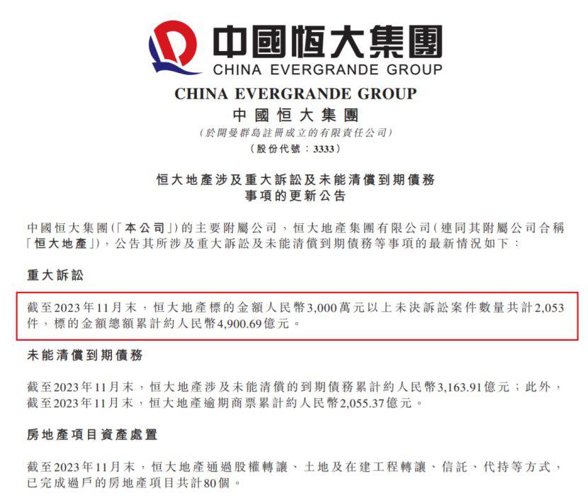 另据中国恒大集团 2025 年 12 月 29 日披露的信息,截至 2025 年 11 月末,恒大地产标的金额 3000 万元以上未决诉讼案件数量共计 2053 件,标的金额总额累计约 4900.69 亿元。