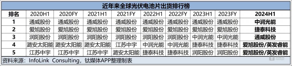 近日,新能源产业研究机构 InfoLink Consulting 公布了 2024 年上半年全球电池片出货排名,引发业内广泛讨论。其中,多年来一直 " 霸榜 " 冠亚军的通威股份(600438.SH)和爱旭股份(600732.SH)分别掉到了第 3 名和第 4 名,去年刚刚跻身三强的中润光能则一举冲上 " 销冠 " 位,如此大的变化究竟有何原因?又是否意味着光伏电池环节迎来了 " 大洗牌 " 呢?