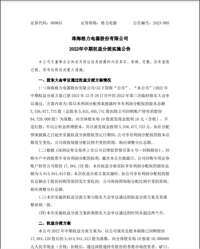 格力电器 ( SZ000651 ) 2 月 20 日晚间公告,2025 年中期权益分派方案为,以公司现有总股本剔除已回购股份 1756.41 万股后的 56.14 亿股为基数,向全体股东每 10 股派发现金股利 10 元(含税),不送红股,不以公积金转增股本,共计派发现金股利 55.37 亿元。股权登记日为 2025 年 2 月 24 日,除权除息日为 2025 年 2 月 27 日。