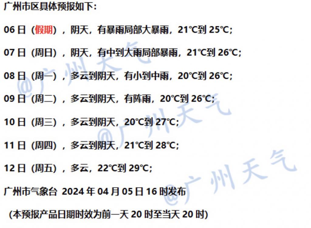 广东省气象台 4 月 5 日预计," 暴雨纷纷 " 天气将在清明假期最后一天延续,并可能持续至假期后的首个工作日。预计 6 日,韶关南部、河源、梅州、珠江三角洲东北部和粤东北部市县有暴雨局部大暴雨,肇庆、佛山、东莞、清远、韶关北部和粤东南部市县有大雨局部暴雨,广东其余市县有(雷)阵雨局部大雨。
