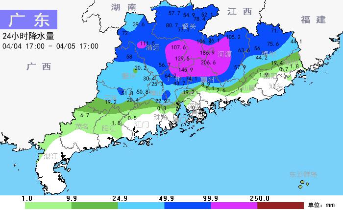 根据广东省气象水文监测,4 月 4 日至 5 日早晨,清远、韶关、河源、梅州、广州北部、惠州北部市县出现了暴雨到大暴雨,部分市县出现了 8~9 级短时大风,清远英德、惠州龙门、肇庆怀集等地出现了局部小冰雹,广东其余市县出现了阵雨局部大雨。