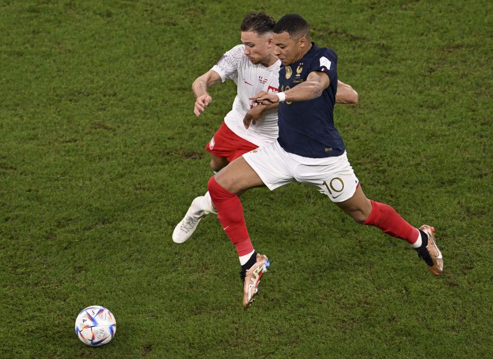 ↓12 月 4 日,法国队球员姆巴佩(右)与波兰队球员卡什在比赛中拼抢