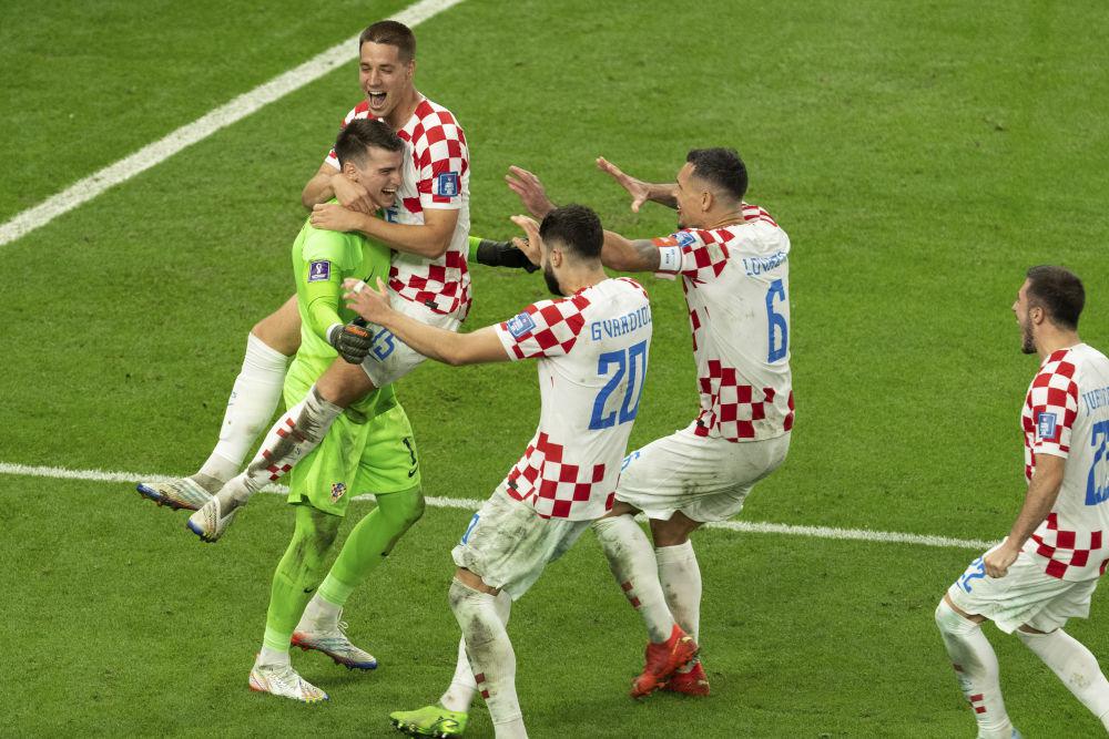↓12 月 5 日,克罗地亚队球员在点球大战战胜日本队后庆祝