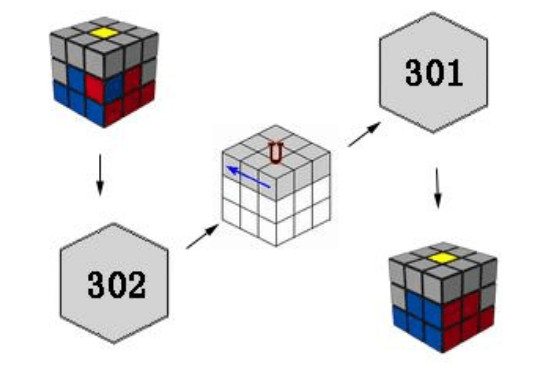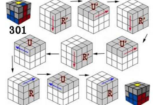 第二层棱块归位也分为三种不同的情况,分别为301、302以及301加上302。301为蓝块处于前面,红块呈倒T字形的情况,此时需要公式R'U'R'U'R'URUR公式,使得蓝块和红块归位。
