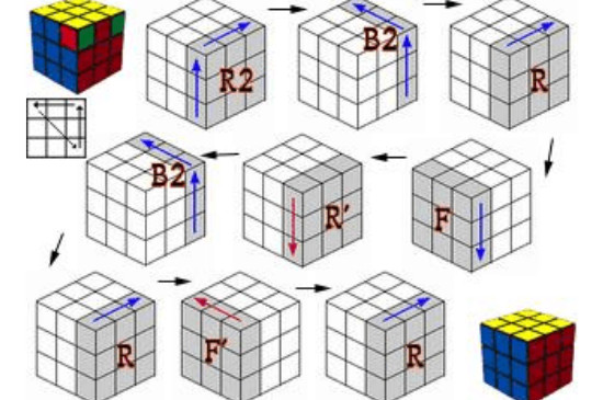 最后一步也分两种情况,一种是两个色块相隔,另一面有相同色块呈对角,一个是两个对角的不同色块。如果是隔角色块则使用R2B2RFR'B2RF'R这个公式一直运用到完成为止。