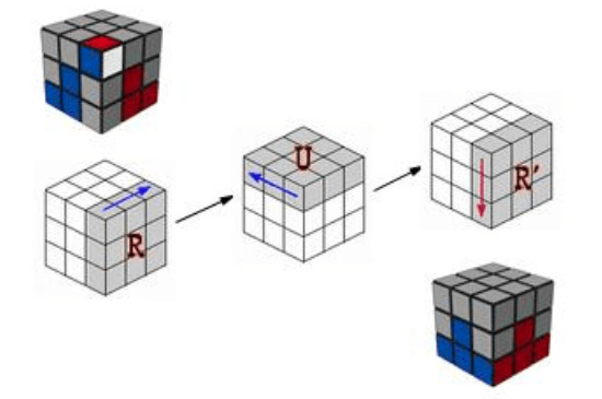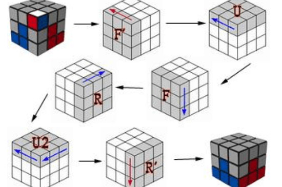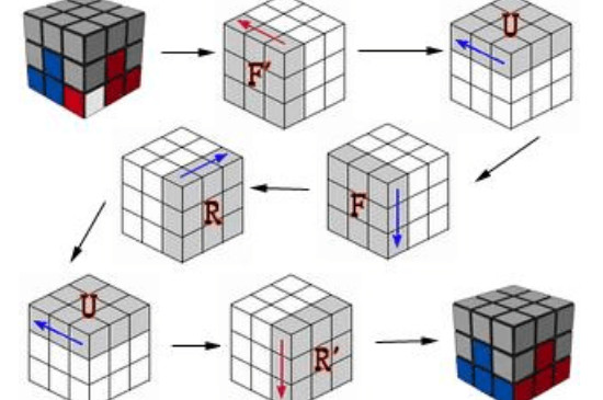 还有一种比较复杂的情况是,白块处于面前的色块底部,夹杂在红色块或者是蓝色块的其中之一,此时就需要用到公式F'UFRUR'进行归位。
