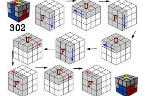 302是蓝块处于前面,蓝块呈倒T字形连接红块直达黄中块的情况,这时候需要用到公式FUFUFU'F'U'F',才能使得红块和蓝块归位。