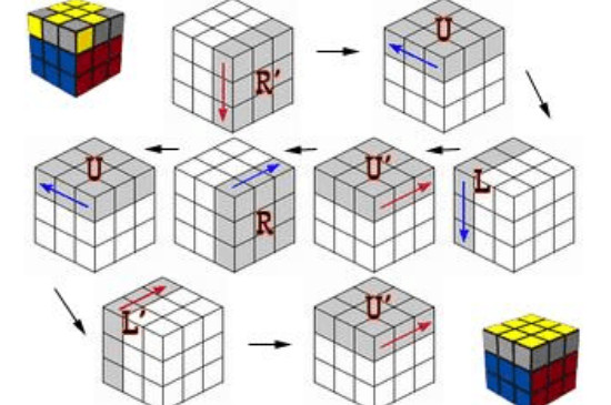 将顶部的十字找到之后,要将顶部还原还需要找到四个角,蓝面的左上方以及红面的左上方剩余的黄面,此时利用公式R'ULU'RUL'U'就可以还原黄面,如果是在红面与蓝面的右上,那么需要公式ULU'R'UL'U'R来还原。