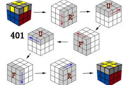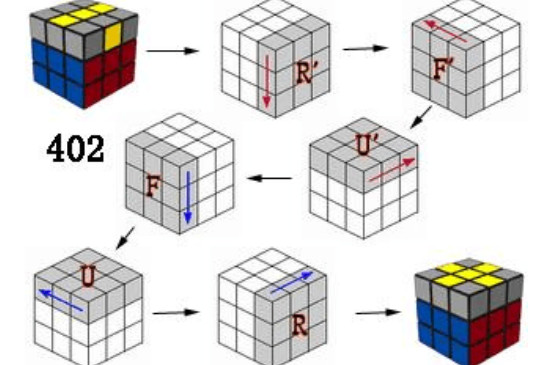 还有一种情况是只有中部的一横行归位,有一个侧面临近的色块在顶部的情况,此时使用402公式R'F'U'FUR,使得色块归位。