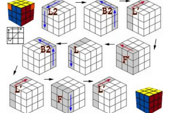 另一个方法是对角的色块,公式是L2B2L'F'LB2L'FL'来完成还原。如果转后还是没有归位,那就多试几次,一直到归位为止。
