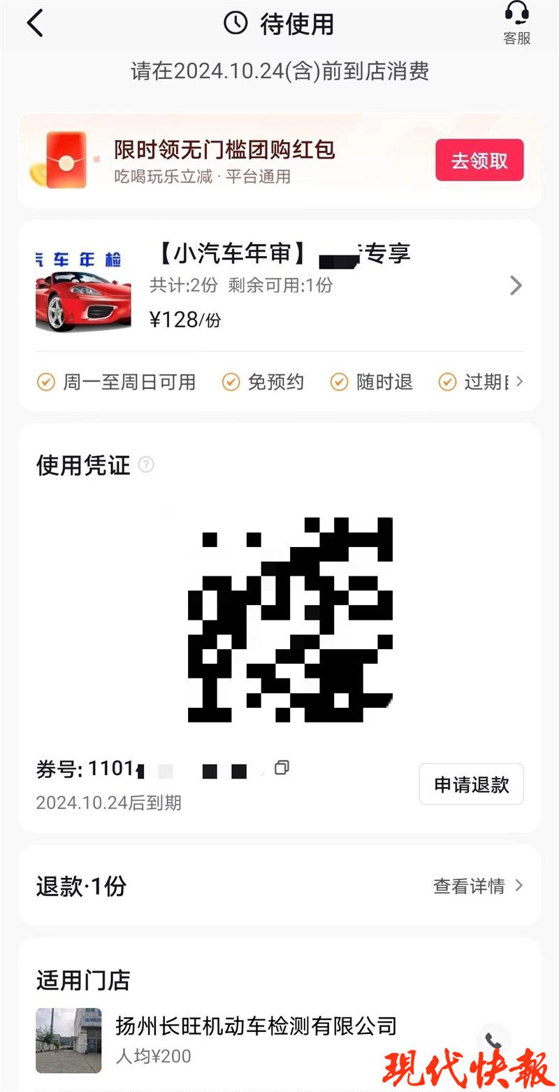 没想到 11 月 1 日,王先生开车去检测时却吃了个闭门羹。" 他们说涨价了,让我要么退费要么补差价。" 对于商家的行为,王先生非常生气," 我明明购买了券,现在(买完)才过了两三天,而且还在有效期内,这是一种不诚信的行为。" 通过王先生提供的购买订单,现代快报记者看到,该券的有效期限为购买后 360 天,直接到店消费,无需预约,并且单次消费不限制使用张数。
