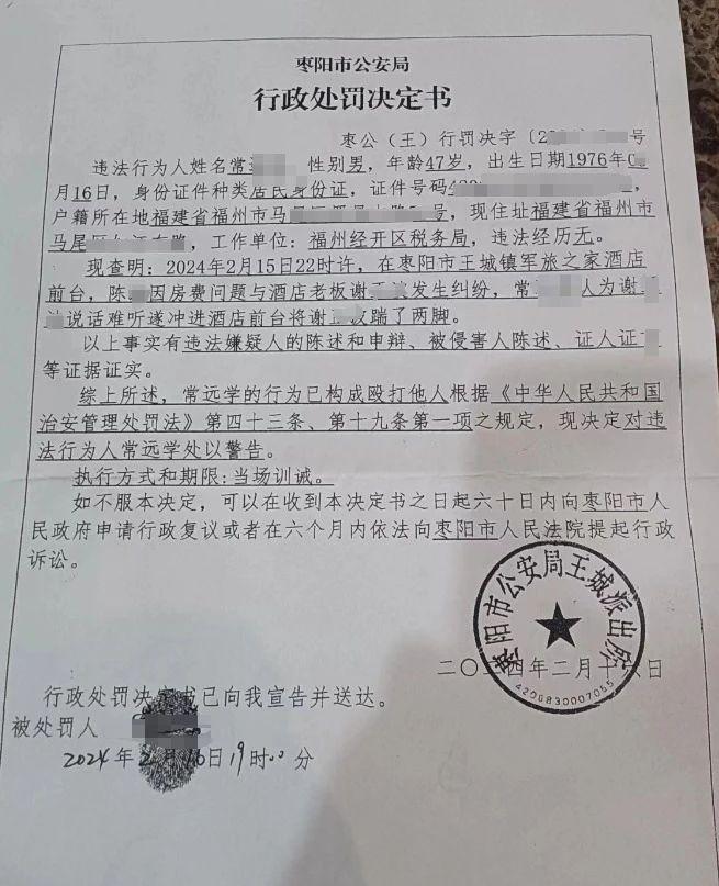 谢先生称,事发 2024 年 2 月 15 日晚上 10 点多,有 3 名男子来到他店中说要开房,后查看房间后说环境太差要退房。谢先生事后了解到,3 人均为公职人员,分别是湖北枣阳市王城镇武装部李某、襄阳市审计局陈某、福建福州市经开局税务局常某。