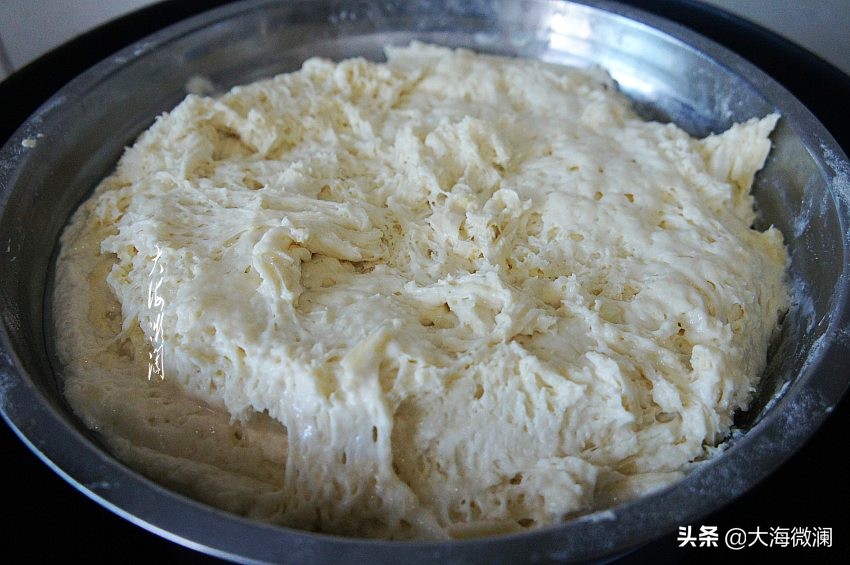 晚上和面,温暖处自然发酵,最好放在不透气的压力锅中或者电烤箱中,不用加热,第二天早上面团发酵的特别好。