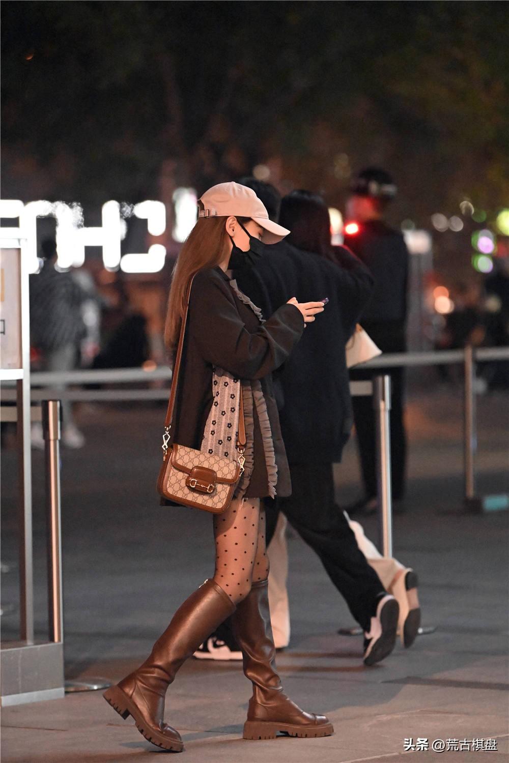 这位美女选择棕色长靴,厚底的款式,也是年轻姑娘喜欢的风格,搭配黑色斑点丝袜,超薄的款式,显得肤色更好一些。