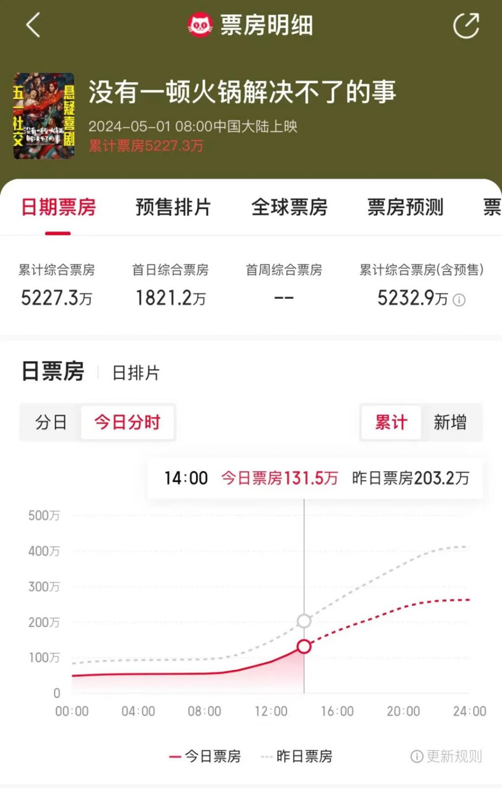 在五一档电影中,该片票房表现并不出色。据猫眼专业版,截至 5 月 5 日 14 时,《没有一顿火锅解决不了的事》票房为 5227 万。其中,影片上映首日票房为 1820.9 万元,次日下跌至 945 万元。