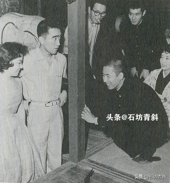 电影《炎上》(1958)片场,左起:三岛由纪夫夫妇、市川昆、市川雷藏 、仲代达矢、新珠三千代