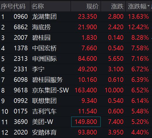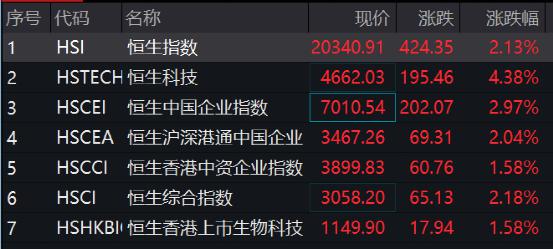 港股市场今日同样高开:恒生指数涨 1.61%,再度突破 20000 点;恒生国企指数涨 2.25%,恒生科技指数大涨 3.56%。截至发稿,恒指涨超 2%,恒生科技大涨超 4%。地产、消费涨幅居前,龙湖集团、海底捞均涨超 10%。