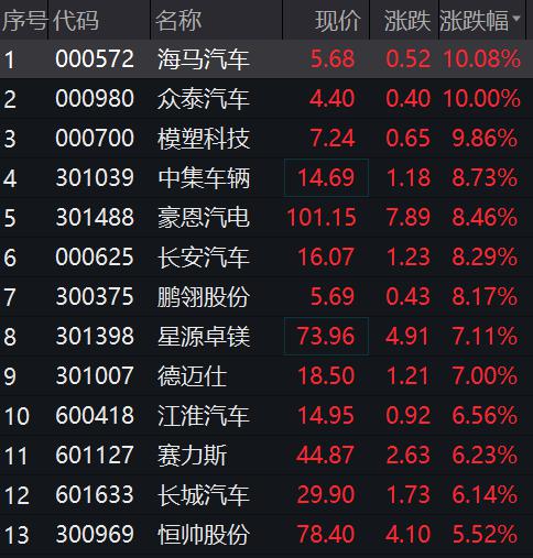 汽车股中,海马汽车、模塑科技、众泰汽车涨停,中集车辆、豪恩汽电、长安汽车、鹏翎股份大涨。