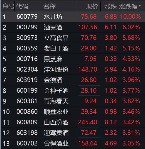 消费股中,白酒板块表现活跃,水井坊涨停,酒鬼酒、老白干、洋河股份、金徽酒等涨幅居前。
