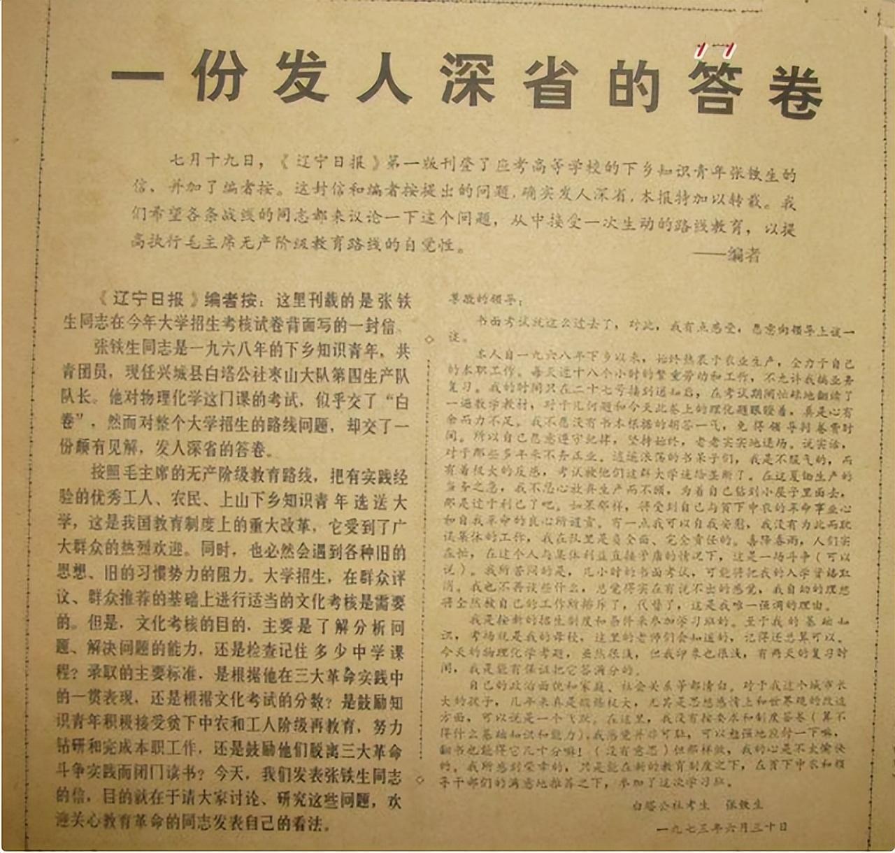 谈到高考的历史,提起当年各地推荐工农兵学员上大学,最有名的,就是1973年被推荐参加高考的˝白卷英雄”张铁生。