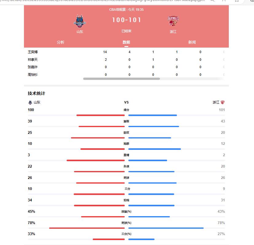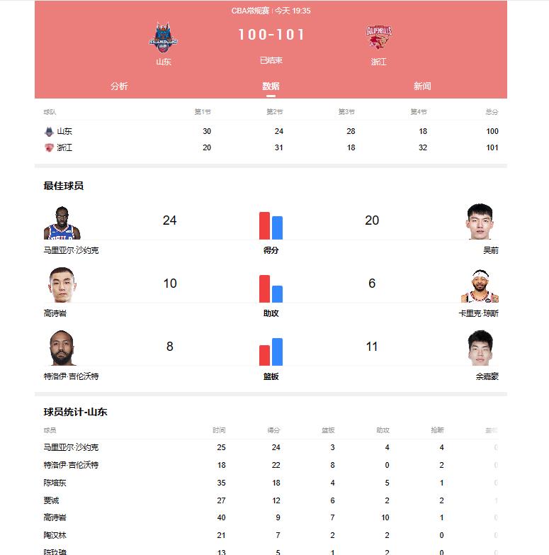 山东高速男篮100比101被浙江稠州逆转绝杀,沙约克24分3板4助4断,吉伦沃特22分8板2断,陈培东18分4板5助1断。山东主场对浙江定比赛胜负的关键就在于比赛最后2分钟,浙江这边吴前、陆文博的三分,琼斯的中距离绝杀命中,山东队陶汉林和沙约克的上篮都在关键时刻咬住了比分,只可惜最后时刻陈培东的三分没能命中。