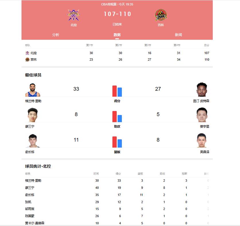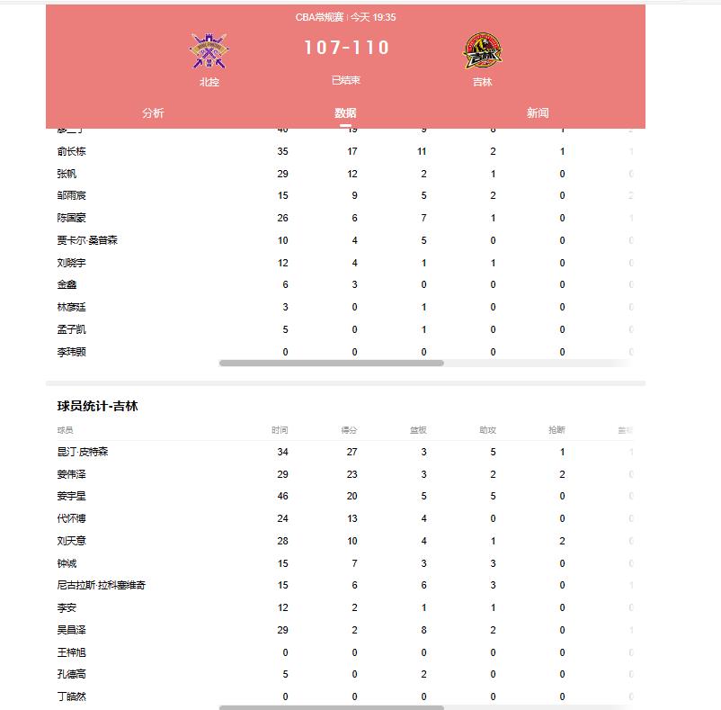 北控107-110惜败吉林。北控:格兰特-里勒33分3篮板;廖三宁19分9篮板8助攻;俞长栋17分11篮板。吉林:昆汀-皮特森27分3篮板5助攻;姜宇星22分5篮板5助攻;姜伟泽21分3篮板。祝贺吉林,输了20几个罚篮,还能客场赢北控。另外北京教练没下课,自己主动辞职的。 赛季第15次两双!