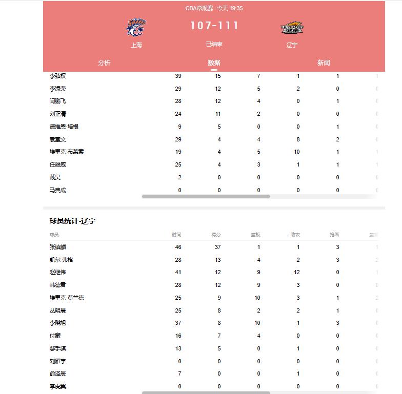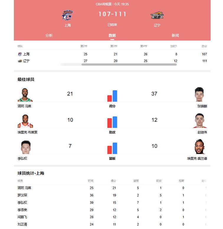 上海久事 冯莱21分5篮板,罗汉琛19分5助攻,李弘权15分7篮板,闫鹏飞12分4篮板,李添荣12分5篮板,刘正清11分;恭喜辽篮加时惊险取胜,继伟加时关键时刻2+1,真的是太拼了