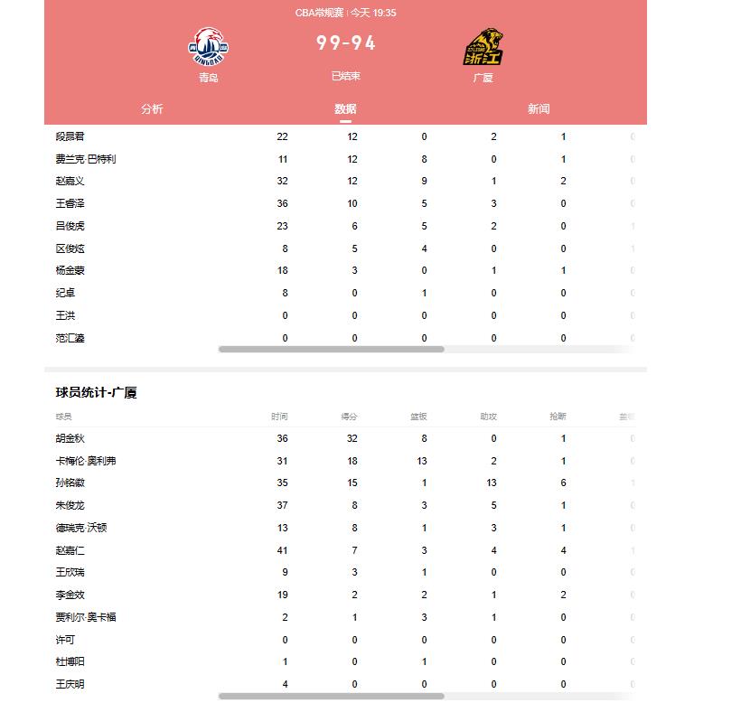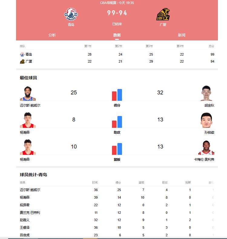 青岛: 鲍威尔26分7篮板4助攻、杨瀚森14分10篮板8助攻、赵嘉义12分9篮板、段昂君12分、巴特利11分8篮板、王睿泽10分5篮板3助攻广厦: 胡金秋32分8篮板、奥利弗18分13篮板、孙铭徽15分13助攻6抢断青岛男篮终结广厦5连胜,王博接受采访:我们连续五个客场,球队表现的比较疲劳 。