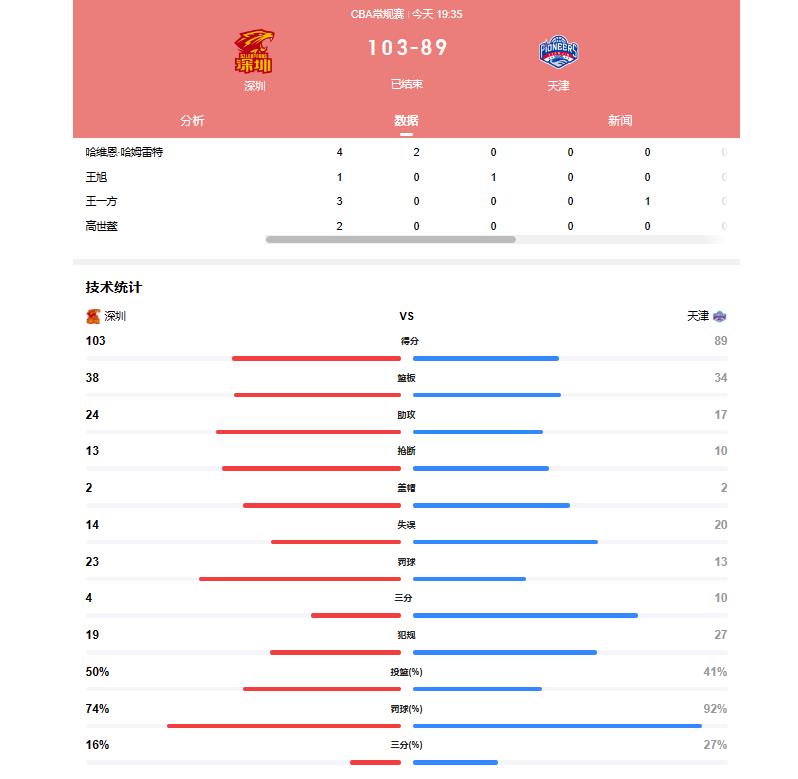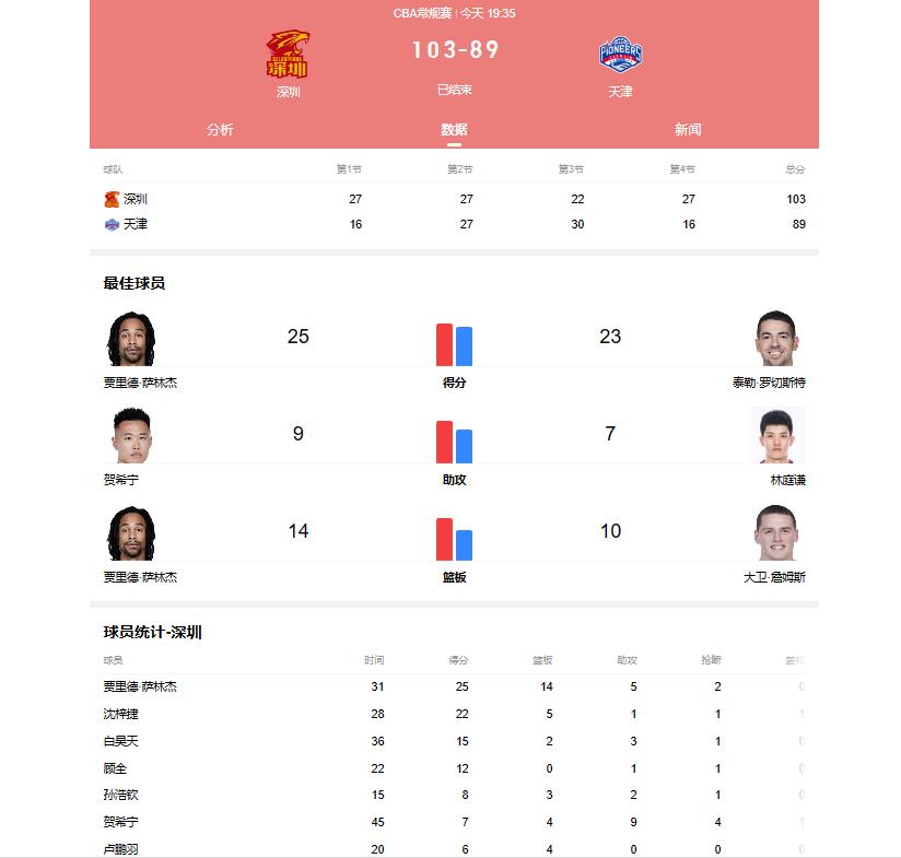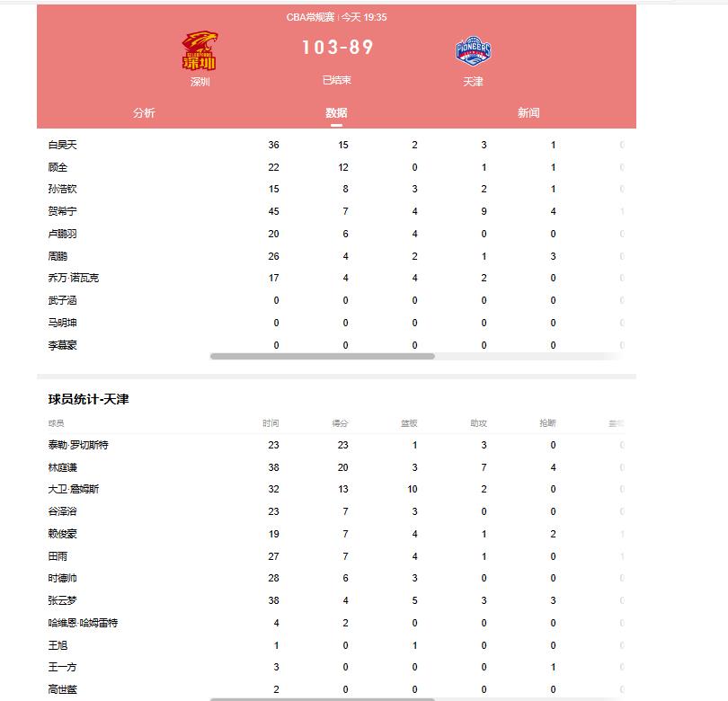 下半场回来,场上局势突变,深圳在前四分钟的时间里一分未得,天津趁势一波13-0的攻势直接反超比分,之后场上比分交替领先,末节深圳连拿七分将分差重新拉开到两位数,天津没有再获得任何机会,最终深圳轻取天津迎来连胜。