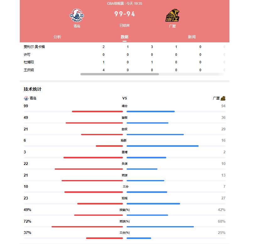 今天CBA常规赛,青岛队主场99-94战胜广厦队,据统计,青岛全队6人得分上双,比对手多抢12个篮板球。此外,杨瀚森14分10篮板8助攻,拿到赛季第15场两双,赵嘉义12分9篮板,关键时刻造成对方3+1。 浙江广厦客场憾负青岛男篮,孙铭徽在协防杨瀚森时手臂被反关节掰伤并退场也是关键时刻广厦饮恨的主要原因之一。孙铭徽今晚非常注意对杨瀚森的夹击和协防,但可能是兴奋过头,两人不时就出现令人揪心的危险对抗动作。