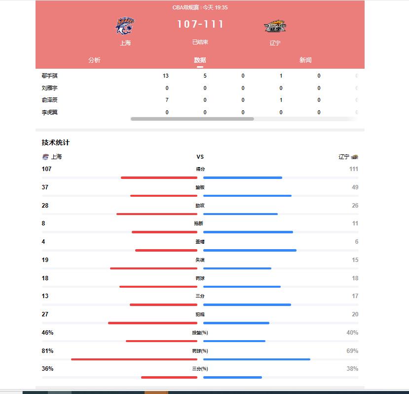 第三节双方进攻都不高,比分咬得很紧。第四节辽宁一度领先9分,上海又追了回来,加时赛,赵继伟抢到制胜篮板,辽宁队111-107击败上海队。