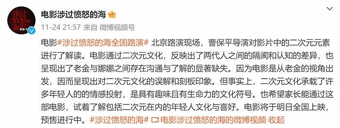 曹保平导演曾在路演中作出了回应,称电影中所呈现的只是从老金的视角出发,对二次元的刻板印象,并非是电影想传达的本意,还呼吁家长试着了解二次元,理解年轻人的喜好。但是有些人依旧不买账,官博下的评论全是质疑的声音。