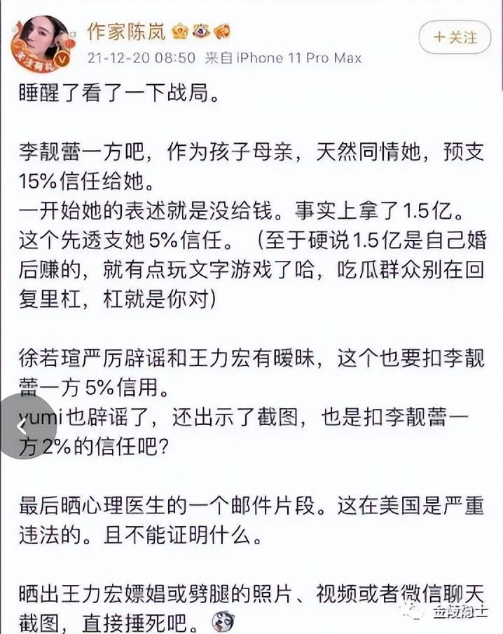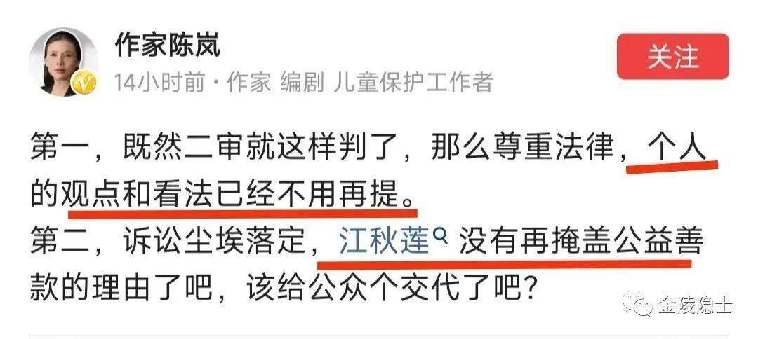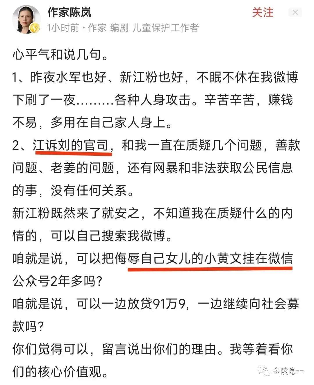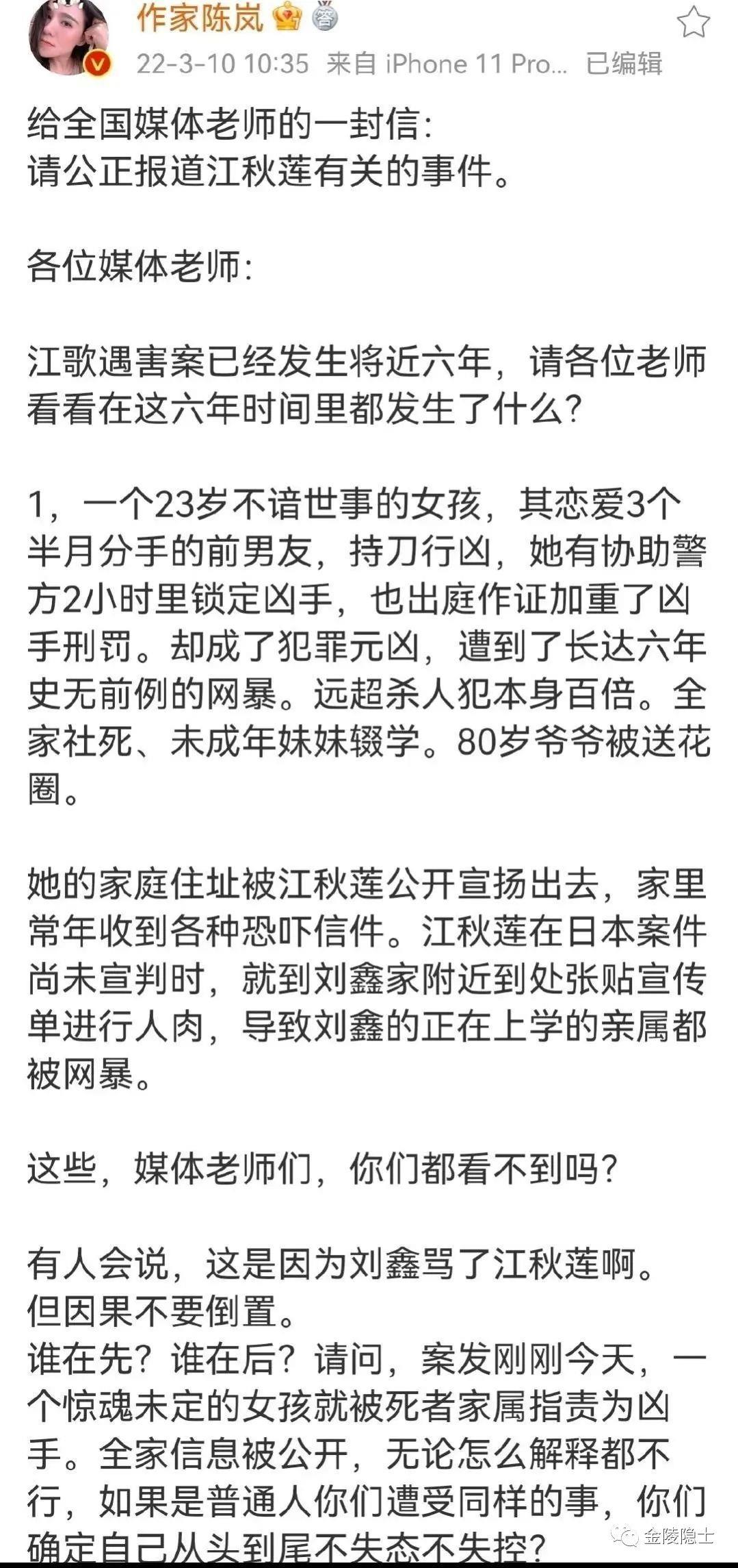 当我们大家都沉浸在感受有温度的法律的同时,咱们的作家陈岚却出来第一时间发声。依然围绕着自己关注的那个点去说。她这么说有2个目的,第一个是怕被喷,第二个目的就是试图扭转矛头指向江歌母亲。