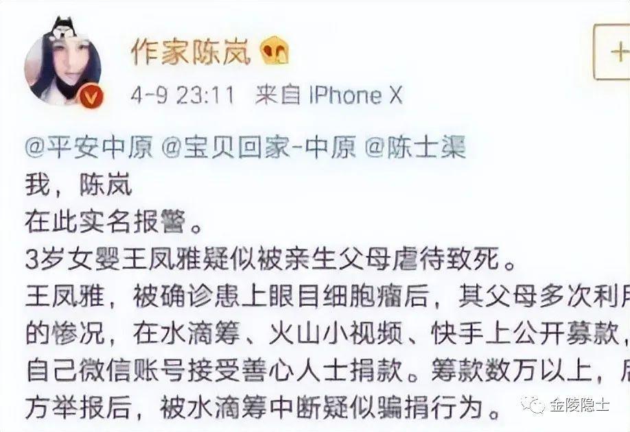 不知道哪根筋错位的作家陈岚不久后在网上炮轰,称王家父母将善款提现后用作他处,而非用于救治王凤雅。
