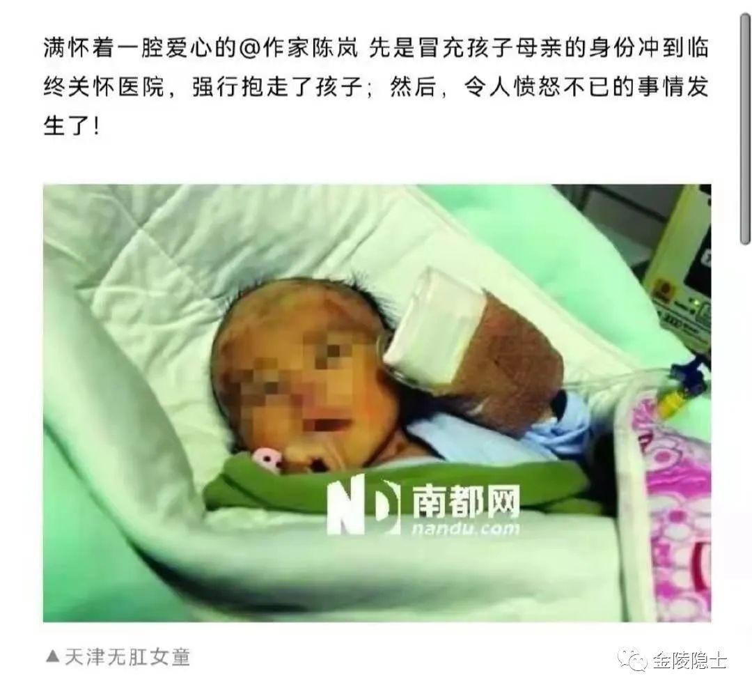 如果上面是陈岚借着热点吃“人血馒头”,那天津无肛女婴事件,就是挑战法律的红线了。