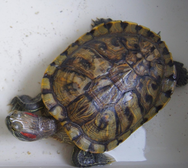 又称红耳龟,巴西彩龟等等。巴西龟头较小,头、颈处布满黄绿相间的纵条纹,眼后有一对红色粗条纹,故而得名“红耳龟”。巴西红耳龟背甲扁平,每块盾片中央有黄绿镶嵌且不规则的斑点,后缘呈锯齿状;指、趾间均具蹼。随着龟的成长,龟壳的颜色也会发生变化,绿色底色会被黄色所逐渐替代,最后成为较暗的褐橄榄色。