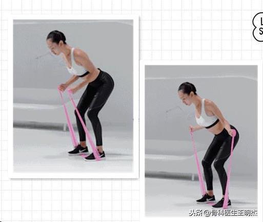 俯身屈膝,双腿与肩同宽,屈双臂于身体两侧。双手握紧弹力带,保持腹部收紧呼吸。保持腰背挺直,双臂外展至与背部平行,鼻吸气口呼气。
