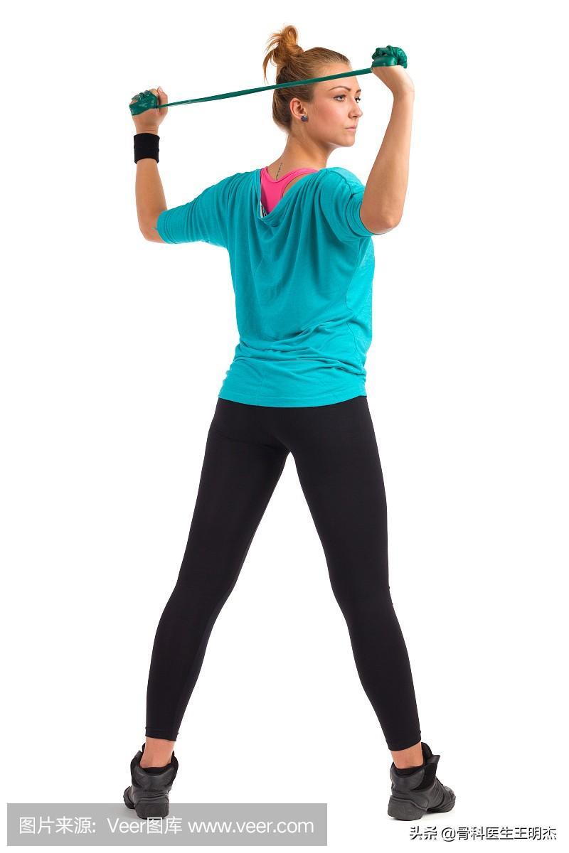 自然站立,双手握紧弹力带保持绷紧,保持腹部收紧。保持腰背挺直,自然呼吸。双臂向上推,使弹力带过头顶,然后下拉至颈后,同时把弹力带向两侧拉伸。