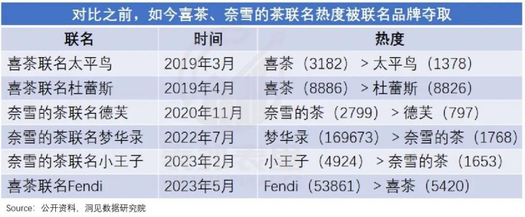 作为交叉验证,也可以看到,此前各种联名活动中,喜茶、奈雪的热度与联名品牌旗鼓相当,甚至略胜一筹。但近两年它们的热度,被联名品牌远远甩在了后面。
